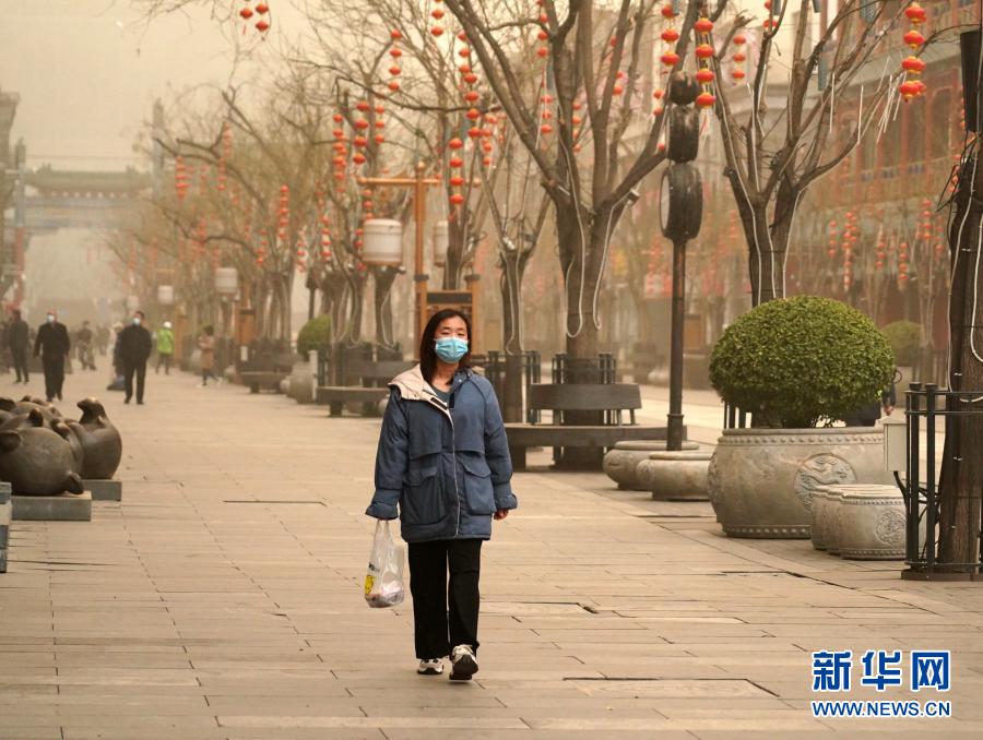 3月15日,行人走在北京前門商業街。當日,我國北方多地出現沙塵天氣。新華社記者 張晨霖 攝