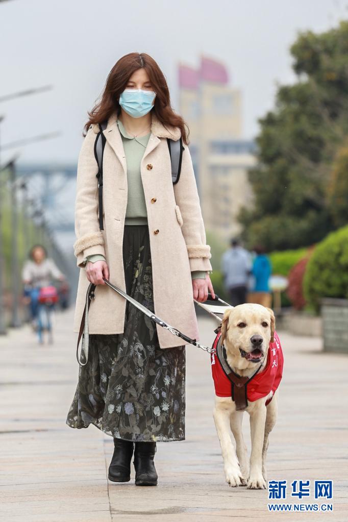 導(dǎo)盲犬“Bingo”陪伴李靜在南京長(zhǎng)江邊的景觀帶散步(3月27日攝)。 新華社發(fā) (張夢(mèng) 攝)