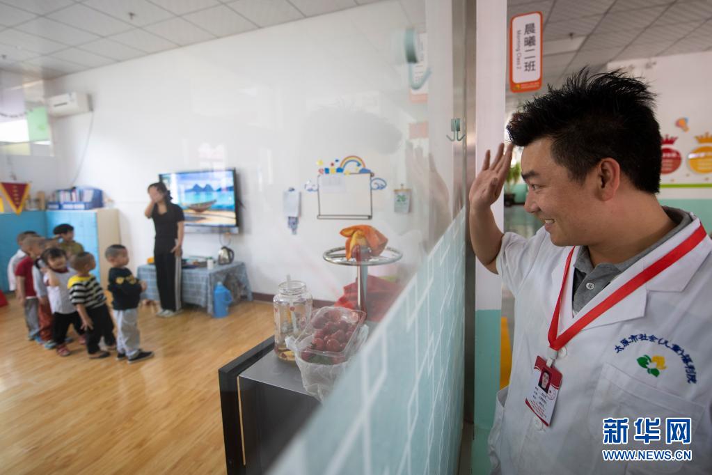 在太原市社會(兒童)福利院內的特教學校,黨龍祥看著正在為六一準備節目的孩子們(5月26日攝)。新華社記者 楊晨光 攝