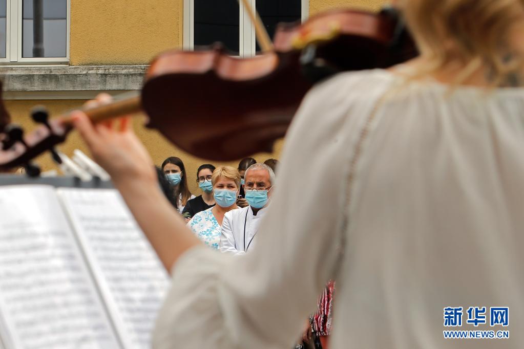 當日,羅馬尼亞首都布加勒斯特一個樂隊在該國一家傳染病醫院——馬太·巴爾什醫院演出,向抗擊新冠疫情的醫務工作者致謝。