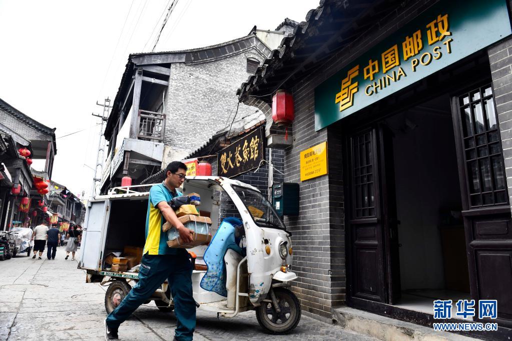 6月20日,在微山縣南陽鎮,郵遞員王少朋在搬卸郵件。