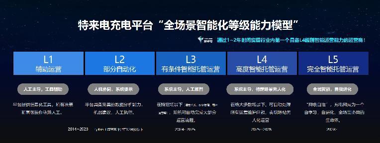 特来电定义了充电平台L1-L5“全场景智能化等级能力模型”。行业内主流充电平台在L2级及以下,而特来电通过借助AI大模型,实现了L3(有条件智能托管运营),同时在新一代充电网数字化充电平台下,通过1-2年时间将实现行业内首个具备L4级别智能运营能力,为客户提供通往L5级无人值守运营的最优路径,线下场站全自动,线上运营全智能。