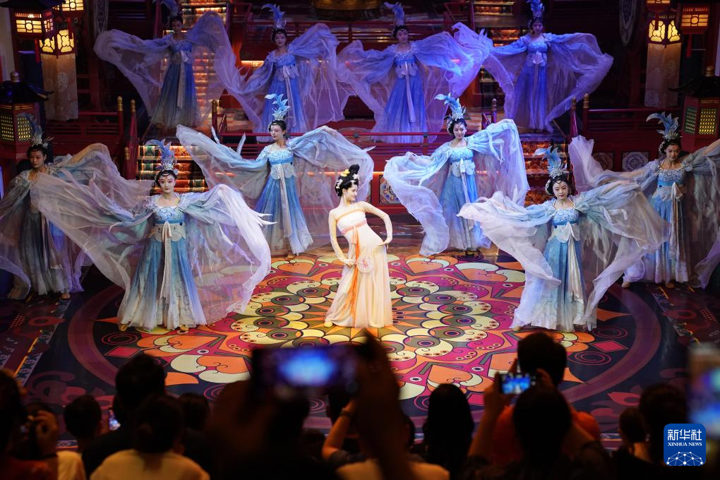 5月19日,游客在西安长安十二时辰景区观看表演《霓裳羽衣舞》。