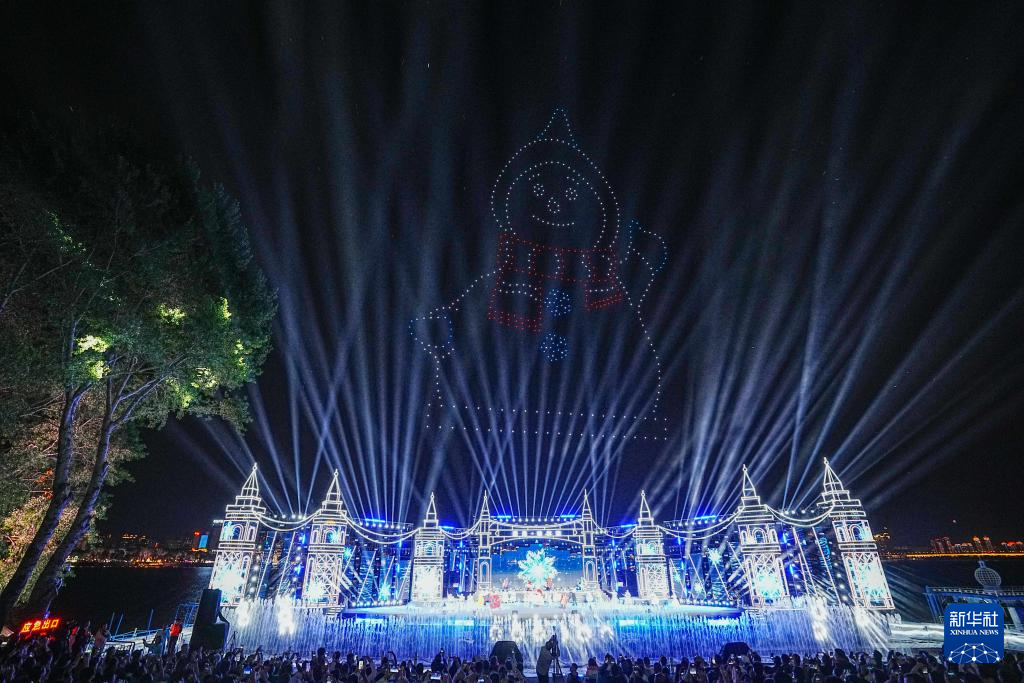 6月10日,观众在观看《遇见·哈尔滨》演出现场上空的无人机表演。