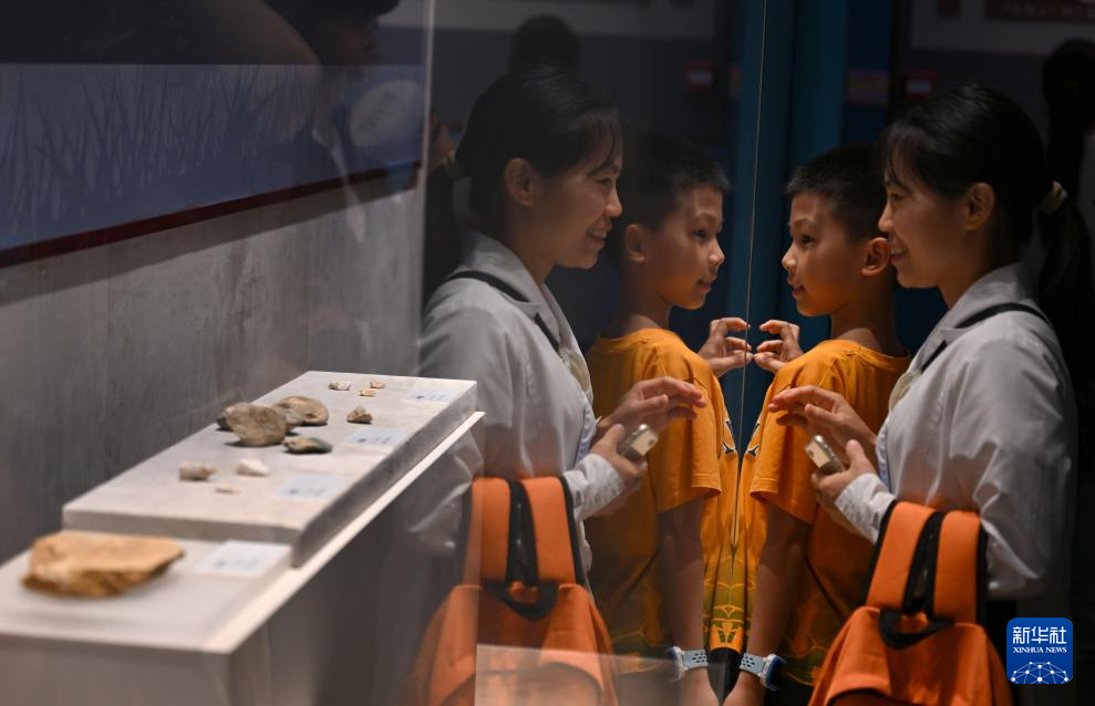 7月30日,家长带着小朋友观看展览。