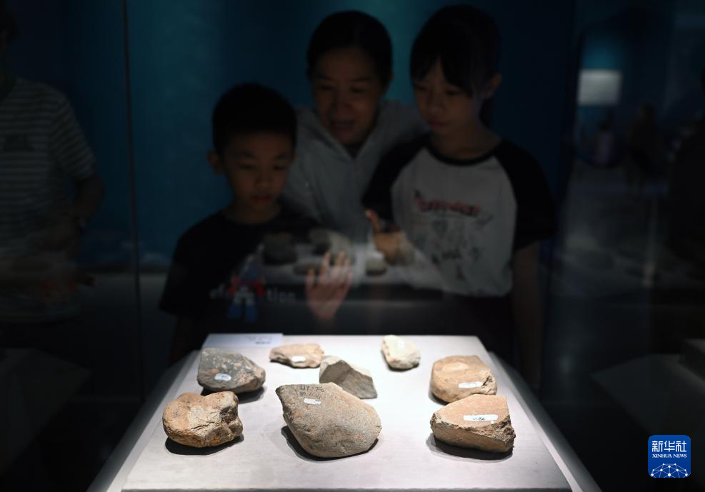 7月30日,一名小朋友在展览上观看“北京人”复原像。