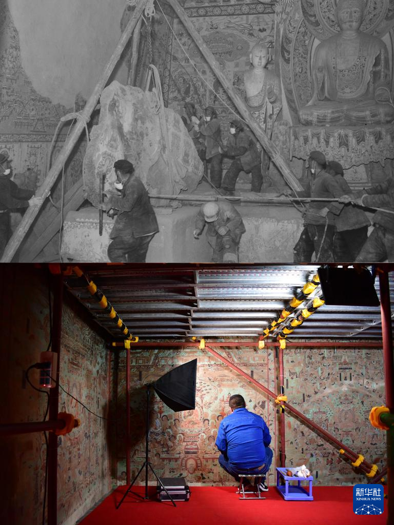 拼版照片:上图为1957年10月,工作人员在莫高窟196窟内处理坠落的窟顶壁画(资料照片,敦煌研究院供图);下图为2022年5月16日,在莫高窟第231窟,敦煌研究院文物保护技术服务中心工作人员杨金礼在修复出现病害的壁画(新华社记者杜哲宇摄)。新华社发