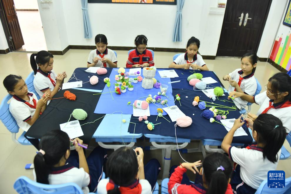 10月10日,在梧州市长洲区凤翔小学,学生们在非遗课堂上编织手工艺品。