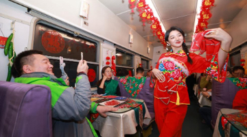 11月25日晚,被誉为“雪国列车”的K7041次列车驶出哈尔滨,开往“神州北极”漠河。这是今年冬天黑龙江省开行的首趟东北民俗主题旅客列车。旅途中,车内挂窗花、贴福字、铺东北大花布,乘务员穿上东北大花袄,为旅客献上东北民俗演出。