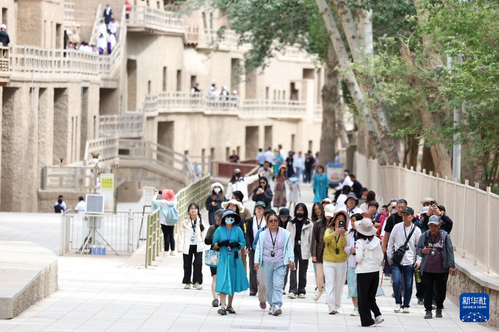 2024年6月7日,前来甘肃调研考察的驻华外交官在敦煌莫高窟九层楼前留影。