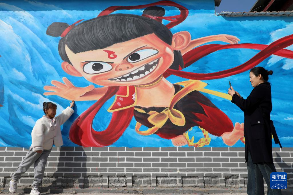3月1日,人们在山东省滨州市博兴县乔庄镇东冯村的哪吒主题墙绘前拍照。