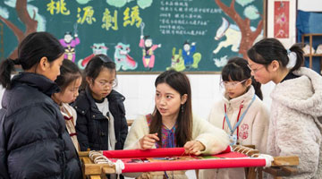白梓忆(前)在编制“熊猫抱竹”盖碗茶杯(3月7日摄)。