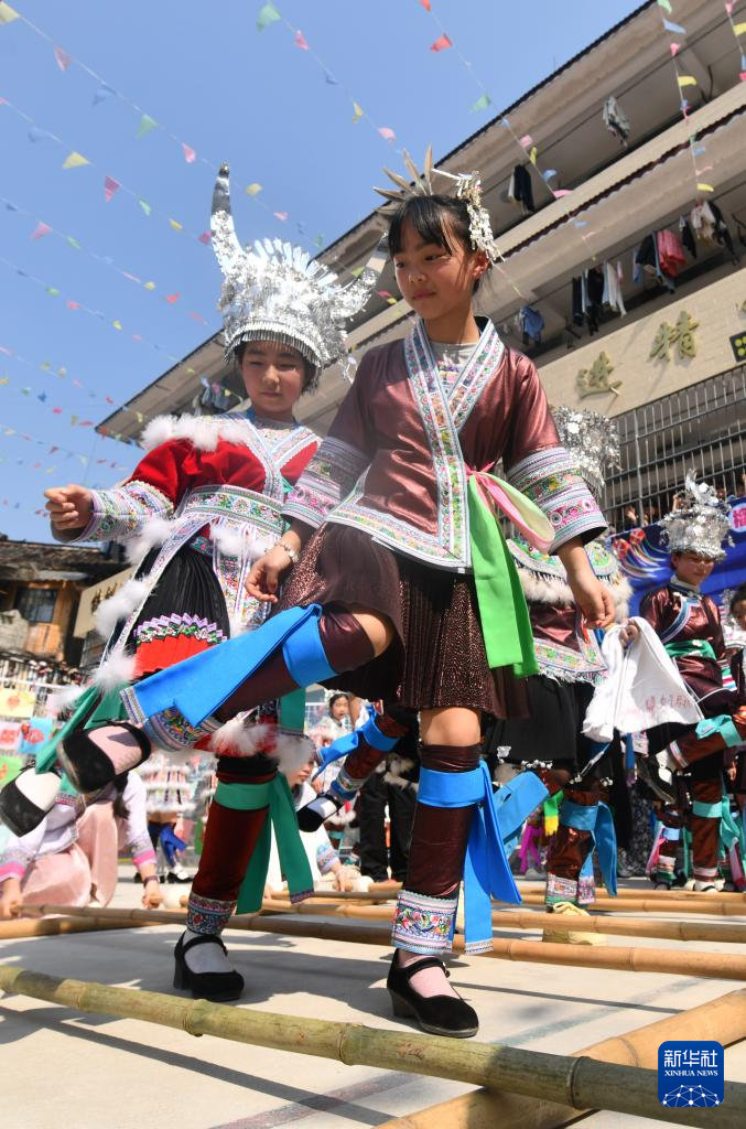 3月25日,柳州市融水苗族自治县杆洞乡中心小学学生在跳竹竿舞。