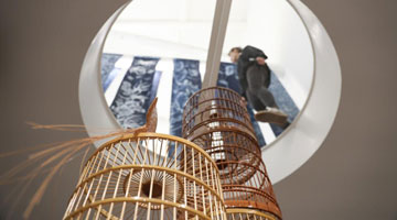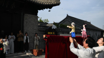 4月28日,观众在青岛电影博物馆农村露天放映场景复原展区参观。