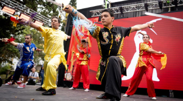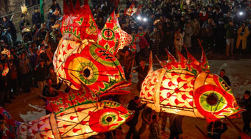 这是5月7日在古镇音乐时装秀上拍摄的传统舞龙表演(无人机照片)。