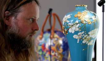 5月18日,小朋友和家长在浙江省余姚博物馆参观西晋越窑青釉黄鼬把瓷鸡首壶。