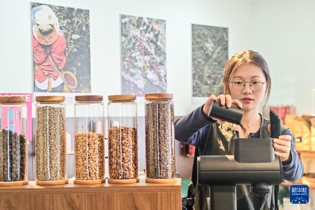 咖啡师在云南省普洱市思茅区老街一家咖啡店研磨咖啡豆(2025年5月16日摄)。