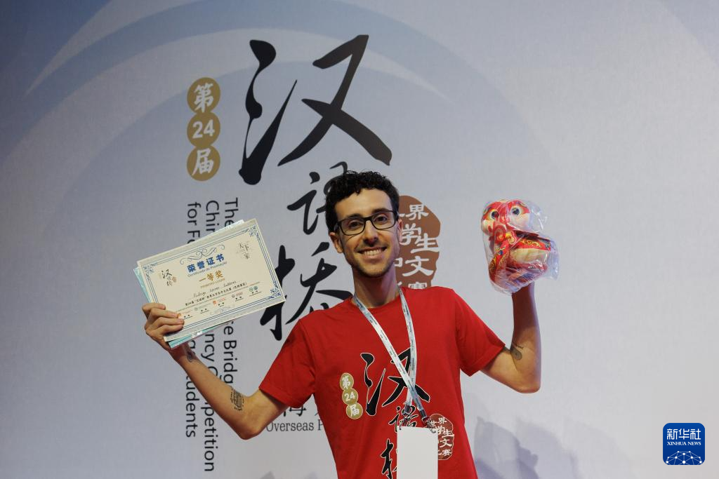 5月18日,在巴西里约热内卢,来自巴西南里奥格兰德州联邦大学孔子学院的罗德里戈·古特雷斯夺得大学生组比赛冠军。