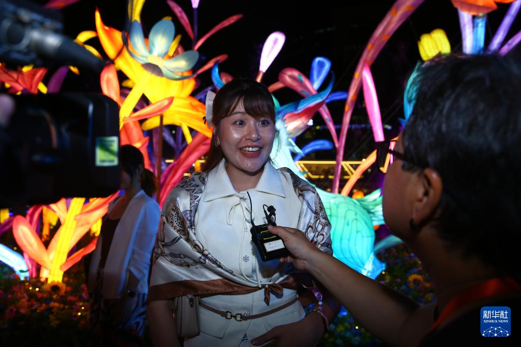 6月28日晚,在泰国曼谷商业地标暹罗天地,泰国姑娘莎拜在灯会上接受新华社记者采访。新华社记者 孙玮彤 摄