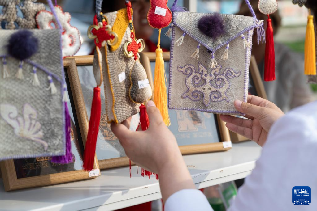 7月1日,游客在“华夏东极”黑龙江省抚远市乌苏镇莫日根广场挑选赫哲族鱼皮手工艺品。
