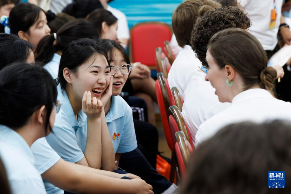 7月14日,在中国交响乐团,河北省正定中学合唱团团员与犹他谷大学合唱团团员交流。
