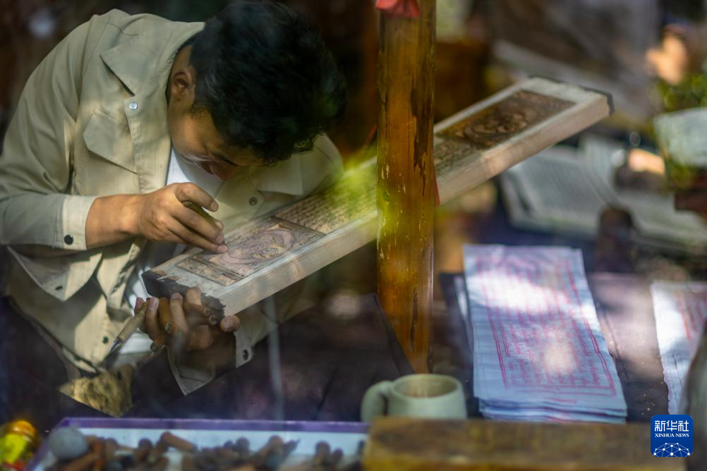 8月6日,一名雕刻师在工作中。西藏雪巴康雕版印刷制作技艺入选西藏自治区级非物质文化遗产代表性项目名录。
