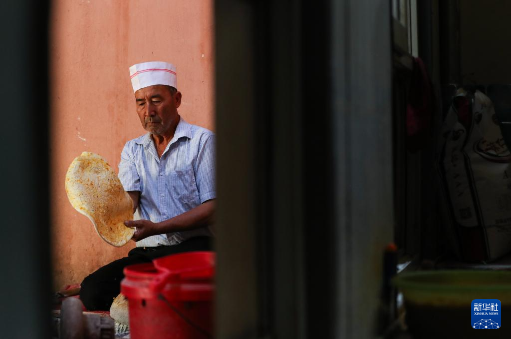 7月22日,在新疆库车市,热西提在自家馕店中打馕。