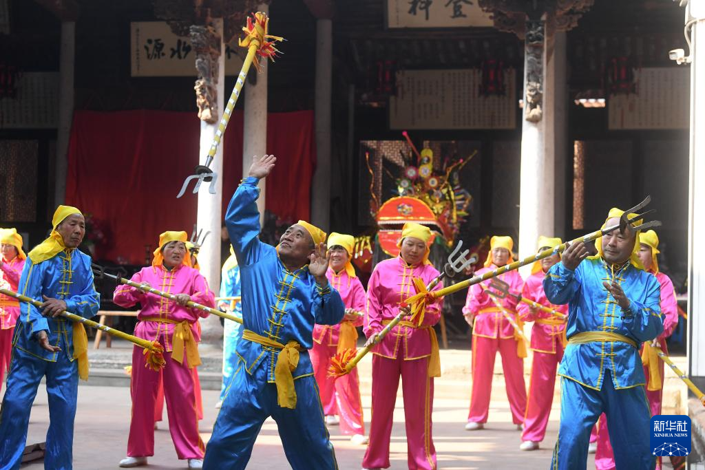 2月4日,在安华镇丰江周村的宗祠,参加联合展演的村民在排练响叉。