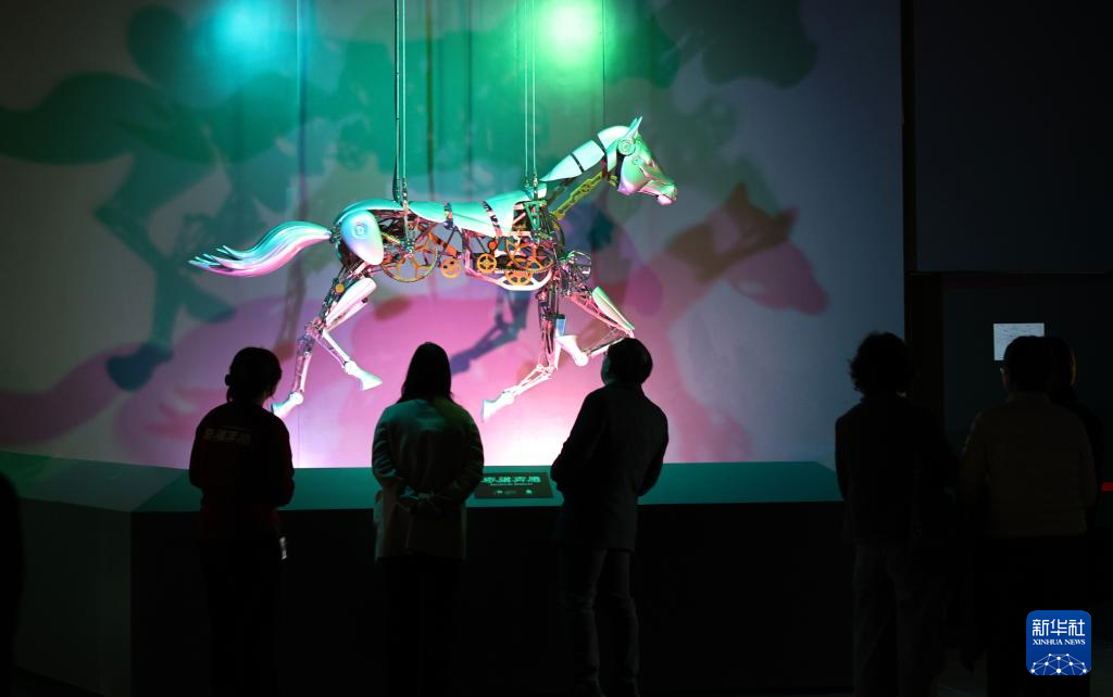 2月10日,参观者在一个机械马展品前驻足观看。
