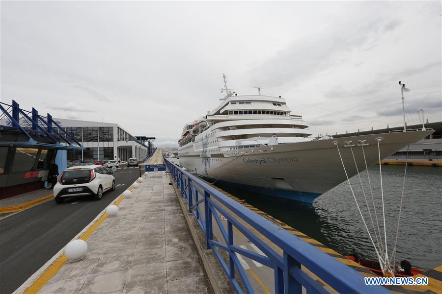 The Celestyal Olympia docks at Piraeus, Greece, on April 21, 2017. The first cruise ship carrying a group of Chinese tourists to the Aegean Sea islands set sail from Greece's Piraeus port Friday after a celebratory event. (Xinhua/Ye Pingfan)