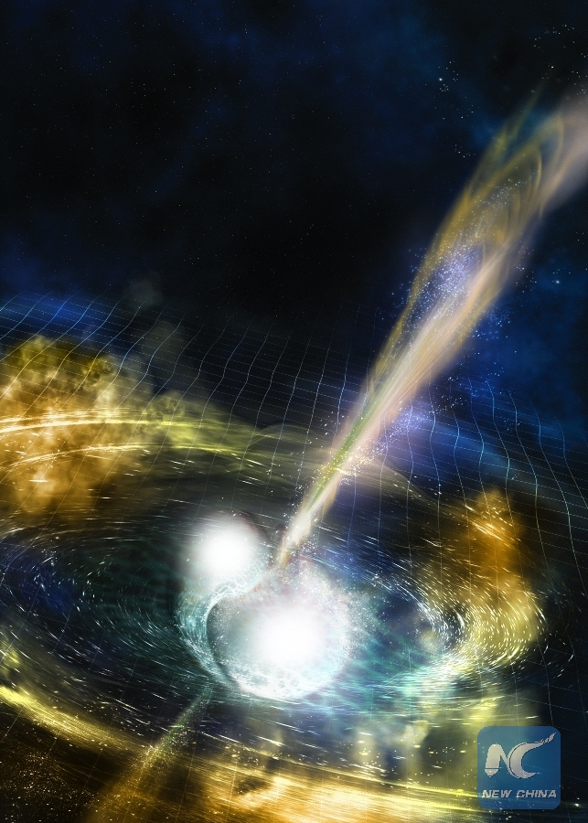 Illustration Image shows two merging neutron stars. The narrow beams represent the gamma-ray burst while the rippling spacetime grid indicates the isotropicgravitational waves that characterize the merger. Swirling clouds of material ejected from the merging stars are a possible source of the light that was seen at lower energies. Scientists announced Monday that they have for the first time detected the ripples in space and time known as gravitational waves as well as light from a spectacular collision of two neutron stars. (Xinhua/National Science Foundation/LIGO/Sonoma State University/A. Simonnet.)