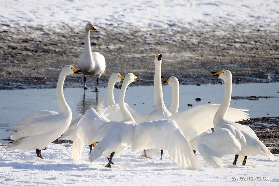 Swans are seen on the snow-covered Swan Lake in Rongcheng, east China's Shandong Province, Dec. 5, 2017. (Xinhua/Wang Fudong)