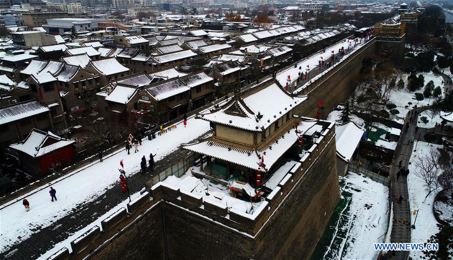 Aerial photo taken on Jan. 7, 2018 shows the snow-covered ancient city wall built in Ming Dynasty in Xi'an, capital of northwest China's Shaanxi Province. (Xinhua/Liu Xiao)