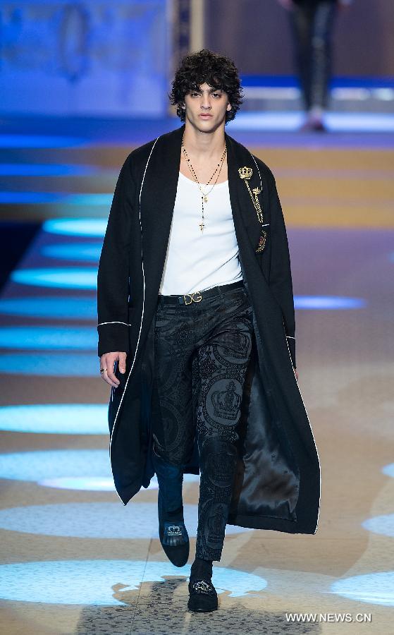 A model presents creations for fashion house Dolce&Gabbana during Milan Men's Fashion Week Fall/Winter 2018/19 in Milan, Italy, Jan. 13, 2018.(Xinhua/Jin Yu)