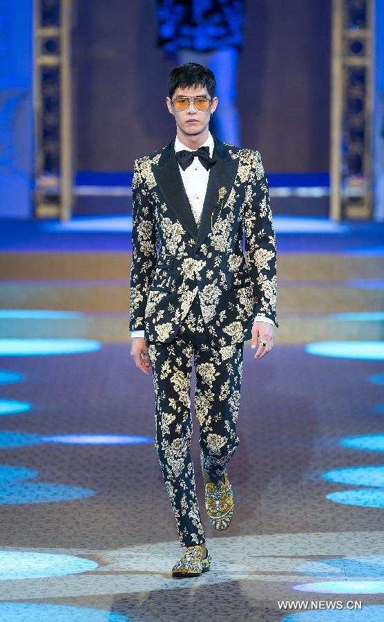 A model presents creations for fashion house Dolce&Gabbana during Milan Men's Fashion Week Fall/Winter 2018/19 in Milan, Italy, Jan. 13, 2018.(Xinhua/Jin Yu)
