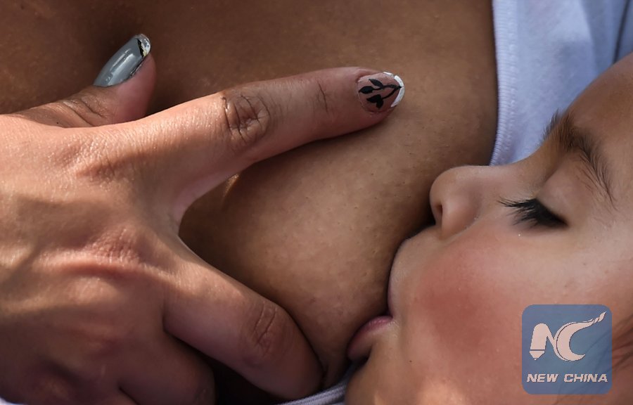 A woman breastfeeds her baby, during a public event to promote the benefits of breastfeeding, at a park in Bogota on November 3, 2017. (Xinhua/ AFP PHOTO)