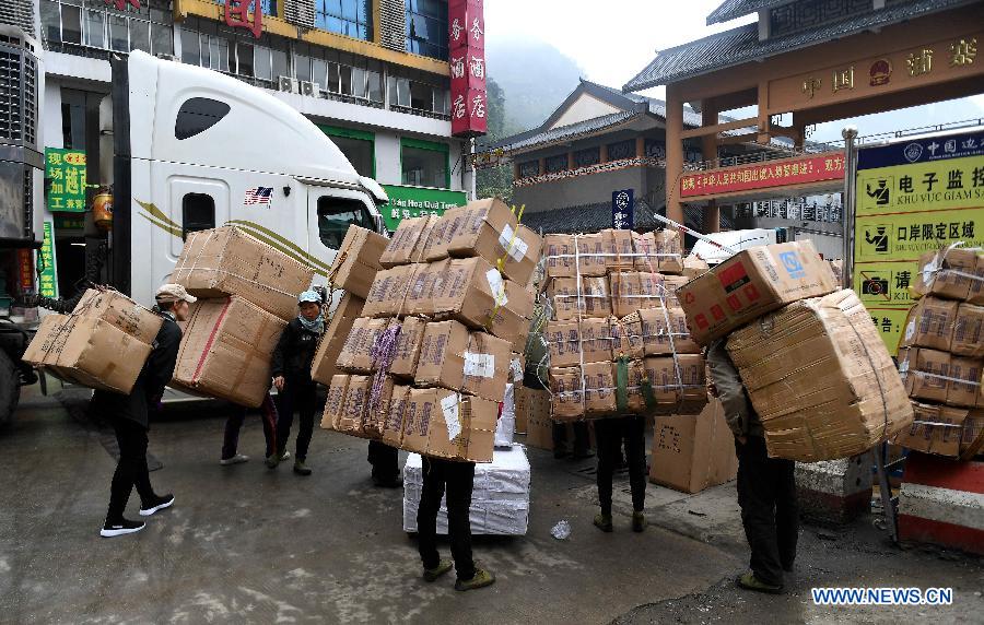 Vietnamese workers transport goods at a border trade center in Pingxiang City of south China's Guangxi Zhuang Autonomous Region, Jan. 16, 2018. By making full use of its geographical location and the potential ofcoastlines and border areas, Guangxi capitalized on its advantages and played a bigger role in the Belt and Road Initiative. Through ports and the Beibu Gulf Economic Zone, the trade cooperation between Guangxi and ASEAN countries gained great prospects.(Xinhua/Zhang Ailin)