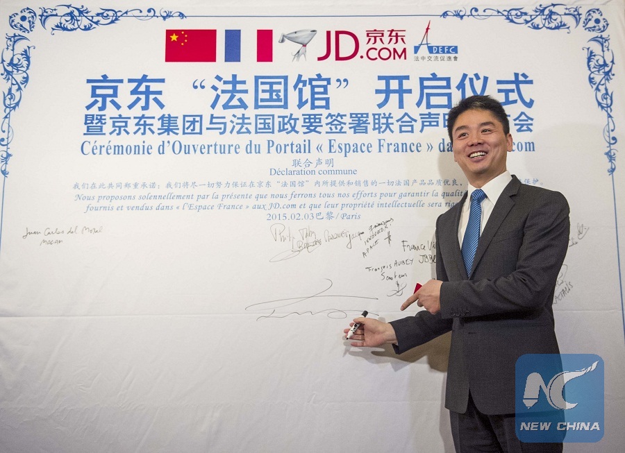 Liu Qiangdong, CEO of e-commerce company JD.com, takes part in the launch ceremony of the French goods department of JD.com, in Paris, France, Feb. 3, 2015. (Xinhua/Cheng Xiaowei)