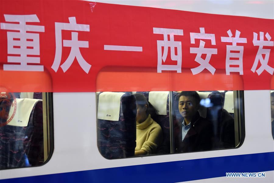 Passengers sit on a bullet train for Xi'an, capital of northwest China's Shaanxi Province, at the Chongqingbei Railway Station in southwest China's Chongqing Municipality, Dec. 6, 2017. High-speed trains linking Xi'an and Chongqing, began operation on Wednesday, slashing the travel time between the two cities from 9.5 hours to just 5.5. The new route includes a new section of the high-speed rail line linking Xi'an with Chengdu, capital of southwest China's Sichuan Province, which also started operation on Wednesday. (Xinhua/Tang Yi)