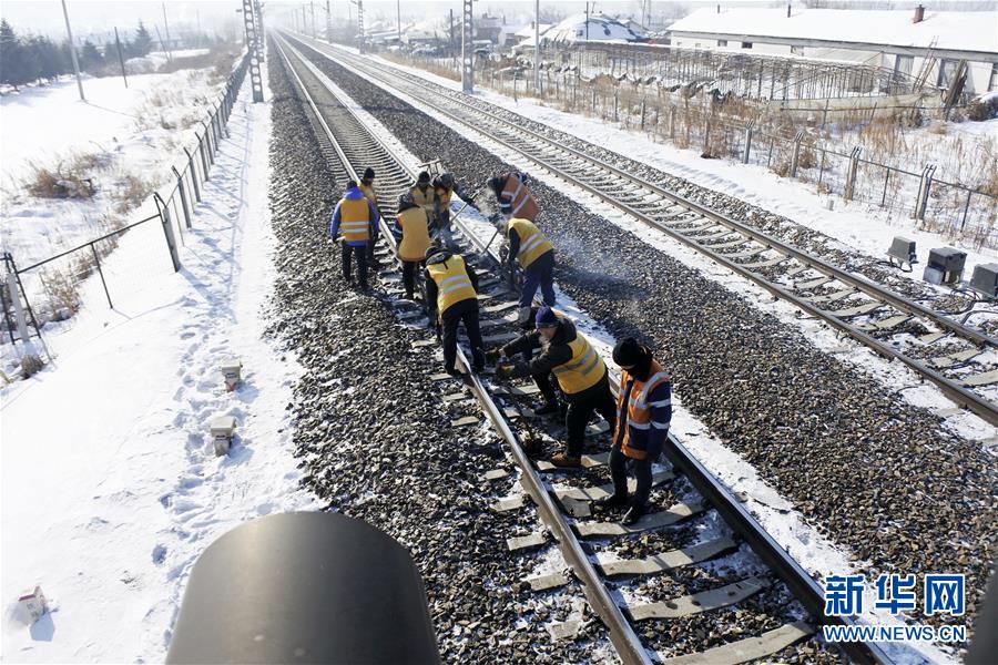 Railway workers take part in the works of routine maintenance of the Harbin-Suifenhe line in Yabuli Town, Shangzhi City, northeast China’s Heilongjiang Province, Jan. 23, 2018. (Xinhua/Zhang Chunxiang)