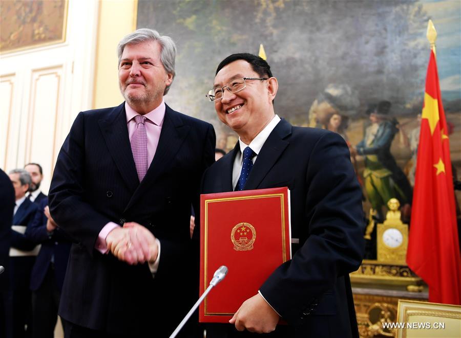 Chinese Minister of Culture Luo Shugang (R) shakes hands with Spanish Minister of Education, Culture and Sport Inigo Mendez de Vigo after signing an agreement over bilateral cultural cooperation in the years between 2018 and 2021, in Madrid, Spain, Jan. 29, 2018. (Xinhua/Guo Qiuda)