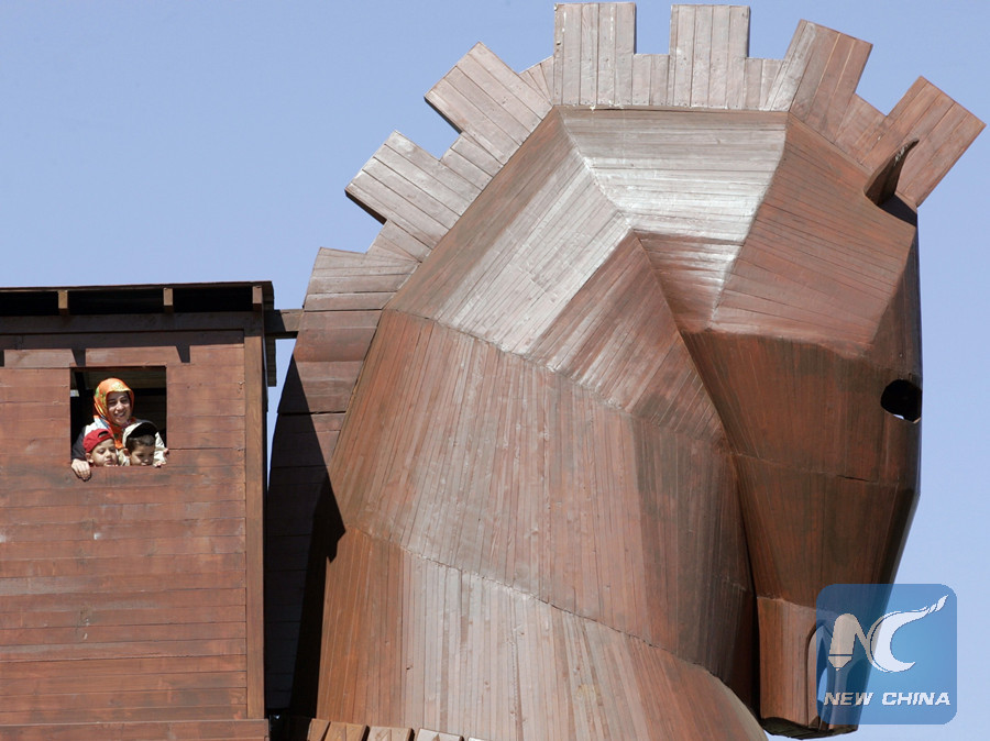 (File photo)A woman and her children look out from inside the wooden replica of the Trojan Horse in Troy, in Dardanelles, July 11, 2007. (Reuters photo)