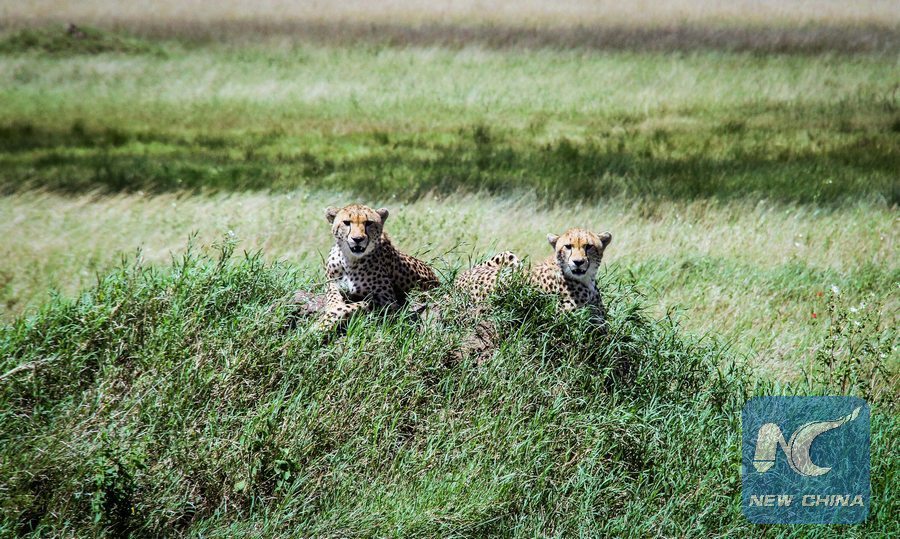 Photo taken on April 11, 2016 shows two cheetahs in Serengeti National Park in northern Tanzania. (Xinhua/Li Sibo)