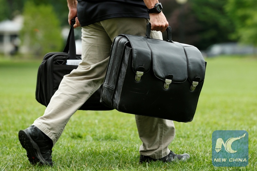 An aide carries a case containing launch codes for nuclear weapons, following U.S. President Donald Trump on the South Lawn of the White House in Washington, U.S., before his departure to Camp David, June 17, 2017. (Xinhua/REUTERS)