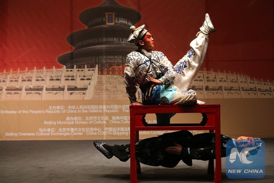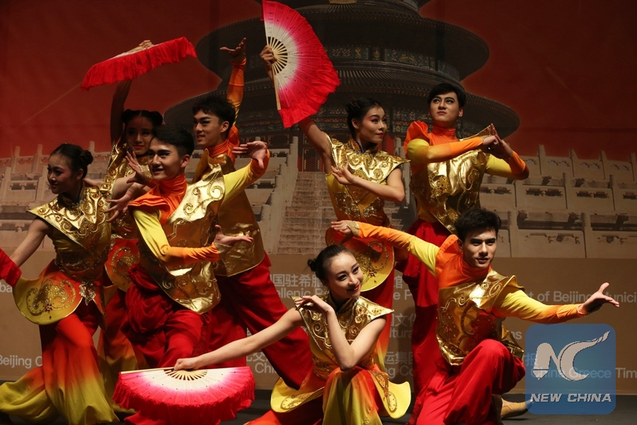 Chinese artists perform at an art show "Happy Chinese New Year, Night of Beijing" in Athens,Greece, on Feb. 10, 2018. Greeks joined their Chinese friends living in Athens on Saturday in celebrations ahead of the Chinese New Year, or Spring Festival. Under the theme "Night of Beijing", artists from the Opera, Dance Academy and National Orchestra of Beijing, along with other troupes, performed traditional dances, theater plays, acrobatics and Chinese martial arts, enthralling the audience. (Xinhua/Marios Lolos)
