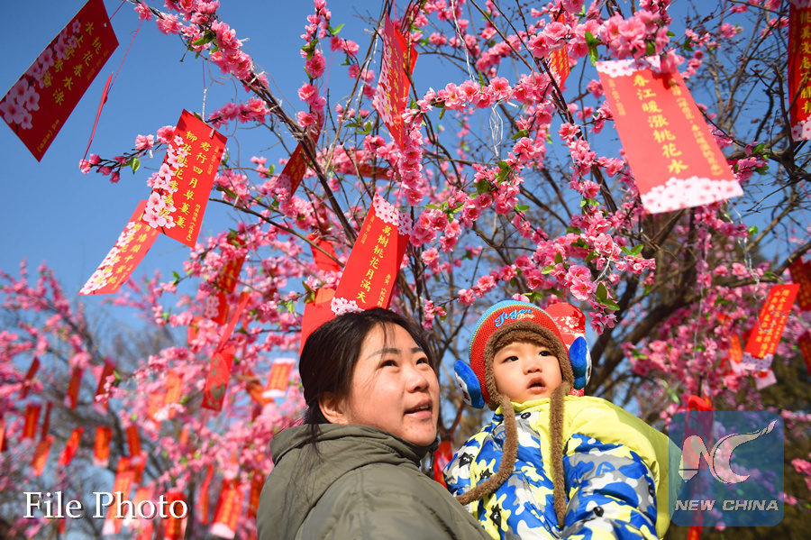 People pose for photos under a tree during a temple fair celebrating the Chinese Lunar NewYear in Hohhot, capital of north China's Inner Mongolia Autonomous Region, Feb. 2, 2017. (Xinhua/Deng Hua)
