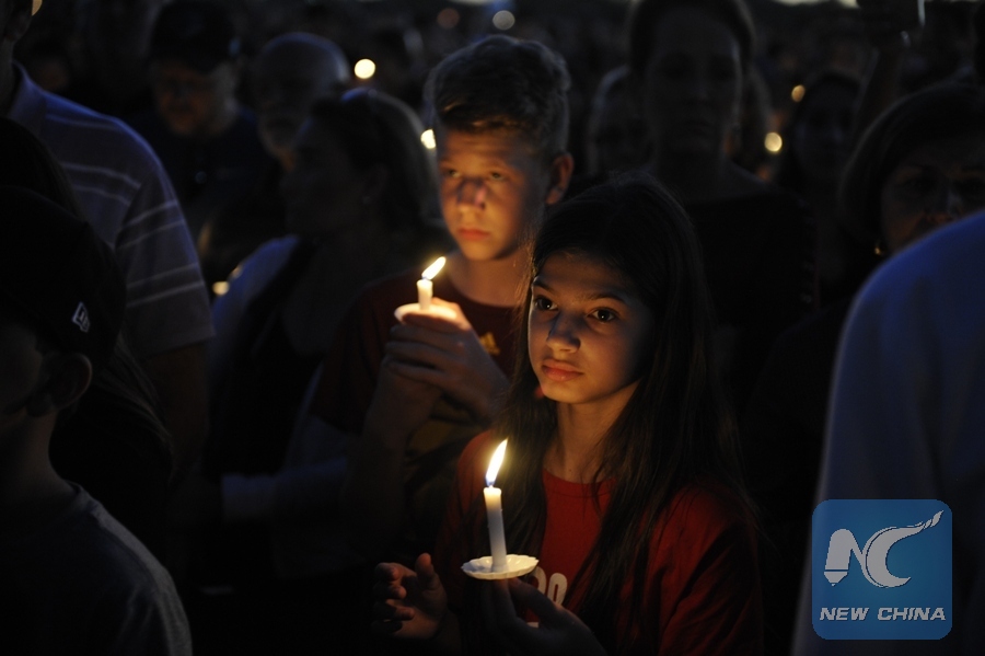 People hold candles during a vigil for the victims of the shooting at Marjory Stoneman Douglas High School, in Parkland, Florida, the United States, Feb. 15, 2018. Seventeen people were killed in a mass shooting in a high school in Florida in the United States Wednesday, local police said. (Xinhua/Liu Yang)