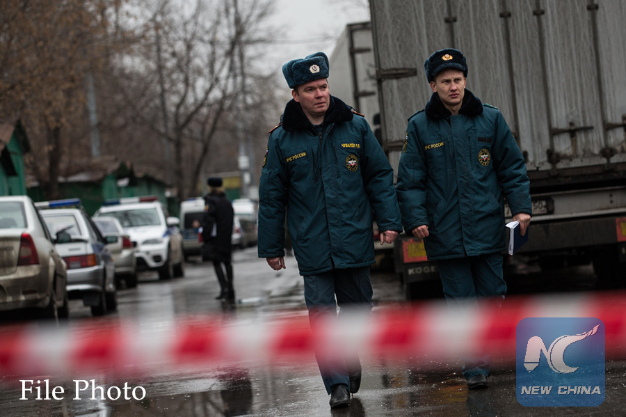 Two police officers walk near the building of the confectionery factory "Menshevik" in Moscow, Russia, where a gunman earlier opened fire, on December 27, 2017. (Xinhua/Wu Zhuang)