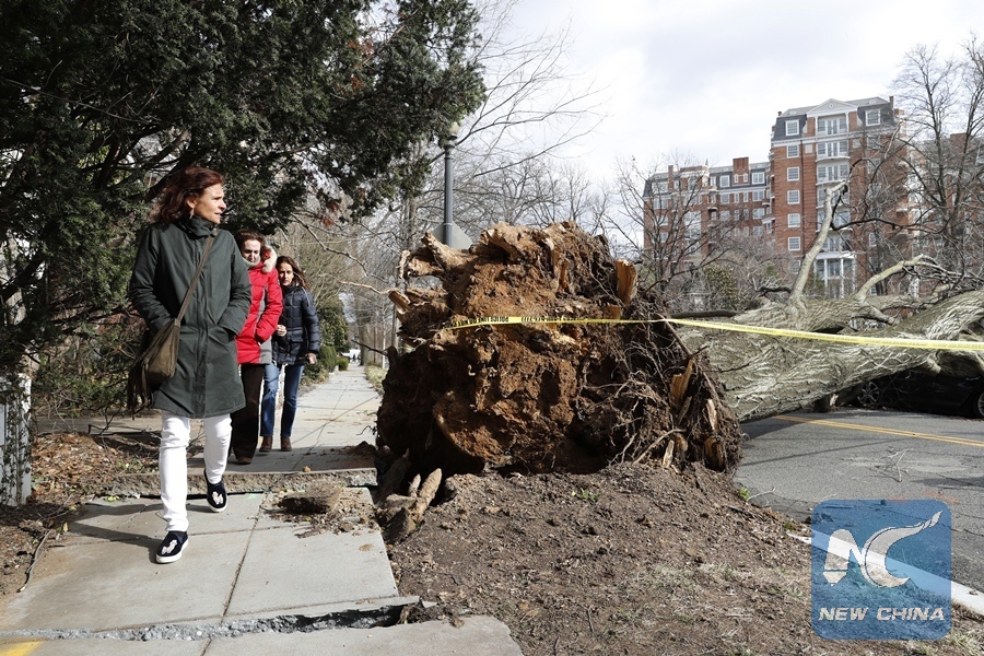 Pedestrians look at a tree blown down by high winds that blocked part of Woodley Road NW in Washington D.C., the United States, on March 2, 2018. (Xinhua/Li Muzi)