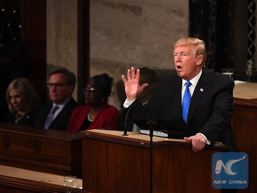 U.S. President Donald Trump delivers his State of the Union address to a joint session of Congress on Capitol Hill in Washington D.C., the United States, Jan. 30, 2018. (Xinhua/Yin Bogu)